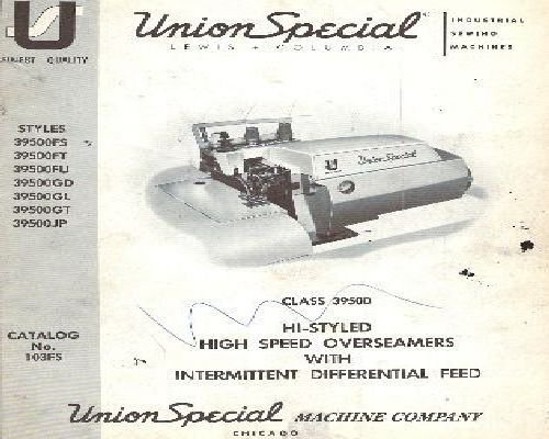 Union Special Class 39500 Styles FS-FT-FU-GD-GL-GT-JP Hi-Styled High Speed Overseamers With Differential Feed Adjustment & Operating & Parts Book